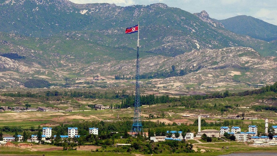 So ungefähr sah es in Wirklichkeit auch aus. Den 160m hohen Fahnenmast mit der 270kg schweren Flagge Nordkoreas sowie das kleine Dorf konnte man richtig gut erkennen.