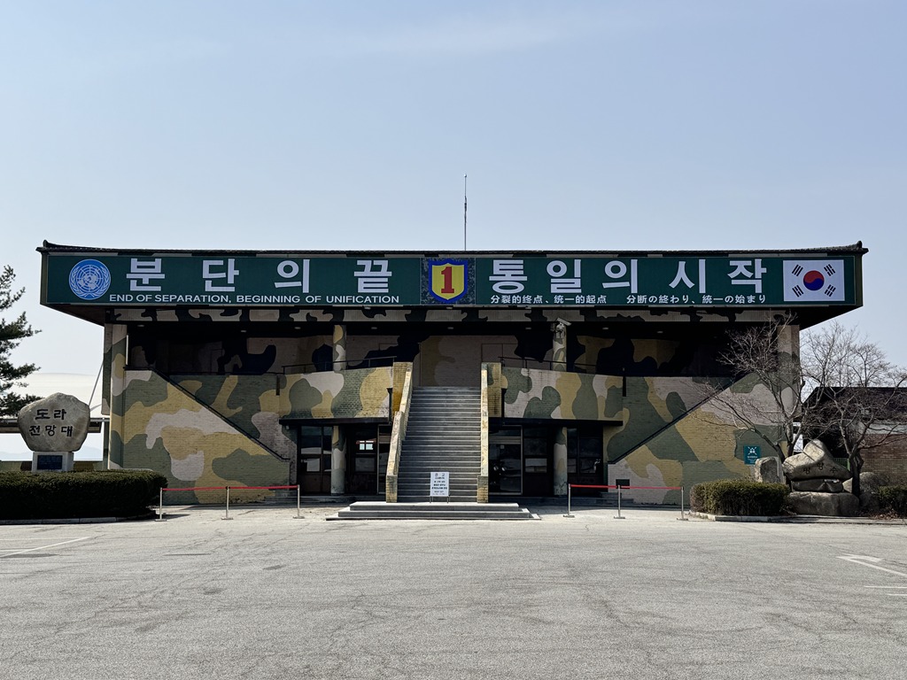 Mit dem Bus ging es nun (endlich) hinüber auf den Grenzstreifen (selbstverständlich nur auf der südkoreanischen Seite). Die alte Aussichtsplattform (Bild links) wurde vor ein paar Jahren gegen das neue dreistöckige “Dora Observatory” (Bild rechts) ausgetauscht. Leider durfte man weder vom Gebäude, noch vom Blick Richtung Nordkorea Fotos machen, daher habe ich mich mal bei einigen Bildern im Netz bedient.
