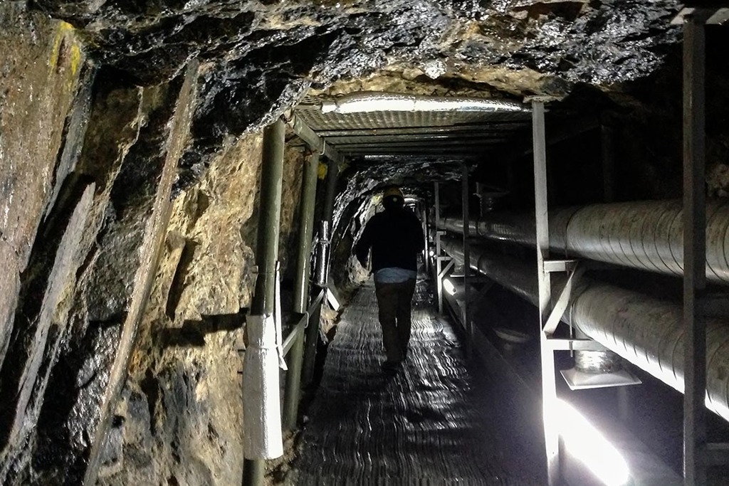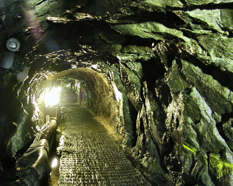 Im Tunnel selber waren Foto`s natürlich wieder NICHT erlaubt. Daher wieder ein paar Bilder aus dem Netz, die es aber wieder ganz gut treffen. Erst geht man 400m mit einem Gefälle von 11% nach unten (Bild links)…